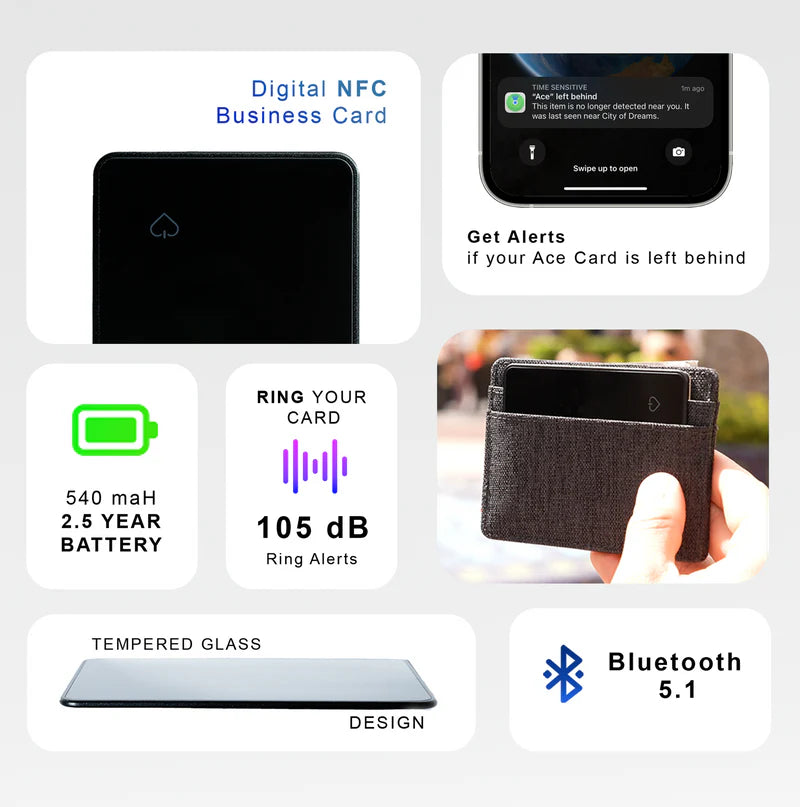 AceCard™ is the world’s thinnest Apple Find My wallet tracker with built-in NFC for digital business cards. It uses Bluetooth 5.0 and the Find My network to show your wallet’s exact location on a map. You can make it play a sound louder than an AirTag to find it nearby. It also sends alerts if you leave your wallet behind and protects your cards with RFID blocking. With a 2.5-year battery life, AceCard offers reliable, secure tracking and easy sharing of your digital identity.