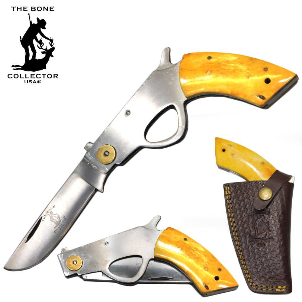 The Bone Collector Gun-Handle Folding Knife features a 3.75-inch stainless steel blade and a 6-inch metal and bovine yellow-bone handle, with a total overall size of 10 inches when the blade is extended. It includes an easy lockback release located on the "hammer" for added convenience. The knife comes with a genuine leather sheath, ensuring safety and comfort while providing quick access when carried, making it an essential companion for any outdoor enthusiast. Designed in the USA and handmade in Pakistan, this knife is crafted with the highest quality materials, showcasing years of industry experience and innovation from the Bone Collector brand.