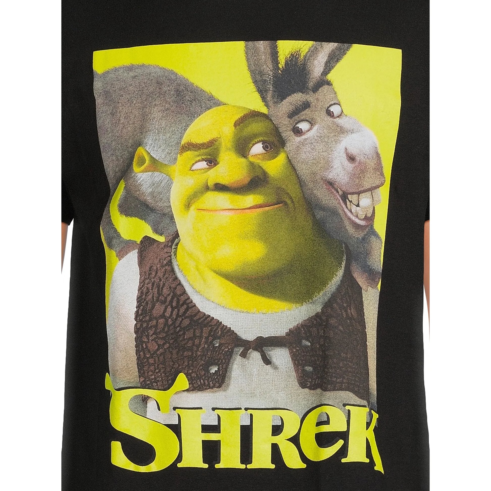 Go on a whimsical fairytale journey with this Shrek Graphic Tee. This solid black tee shirt is crafted from 100% cotton and features a classic crewneck, short sleeves and a relaxed fit. An easy choice for the weekend, this tee can be worn solo or layered with a button-front shirt for added style.