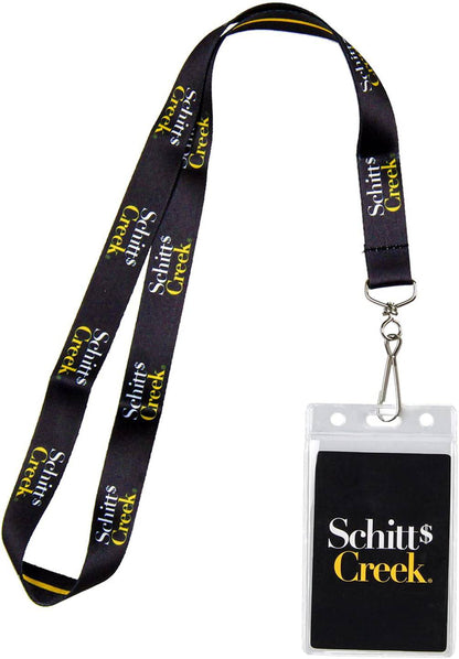 AWESOME DESIGN: This black 1" wide lanyard features an allover Schitt's Creek logo design with a clear ID badge holder and a lanyard clip. Perfect to hold keys or anything you need to stay close and secure.