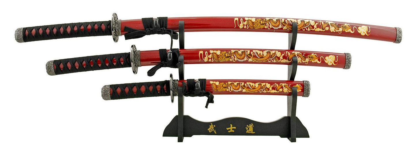 SWSA 124-BDDG Traditional Three Tier Japanese Samurai Katana Set - Red and Black